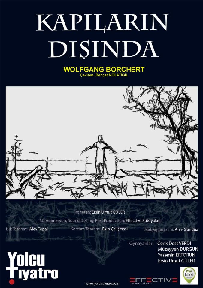 Yolcu Tiyatro seyircisi ile buluştuğu ilk oyun için, tiyatro tarihinin en güçlü savaş karşıtı oyunlarından biri olan, “Kapıların Dışında” oyununu, dijital 3D mapping teknolojisini kullanarak sahneliyor.