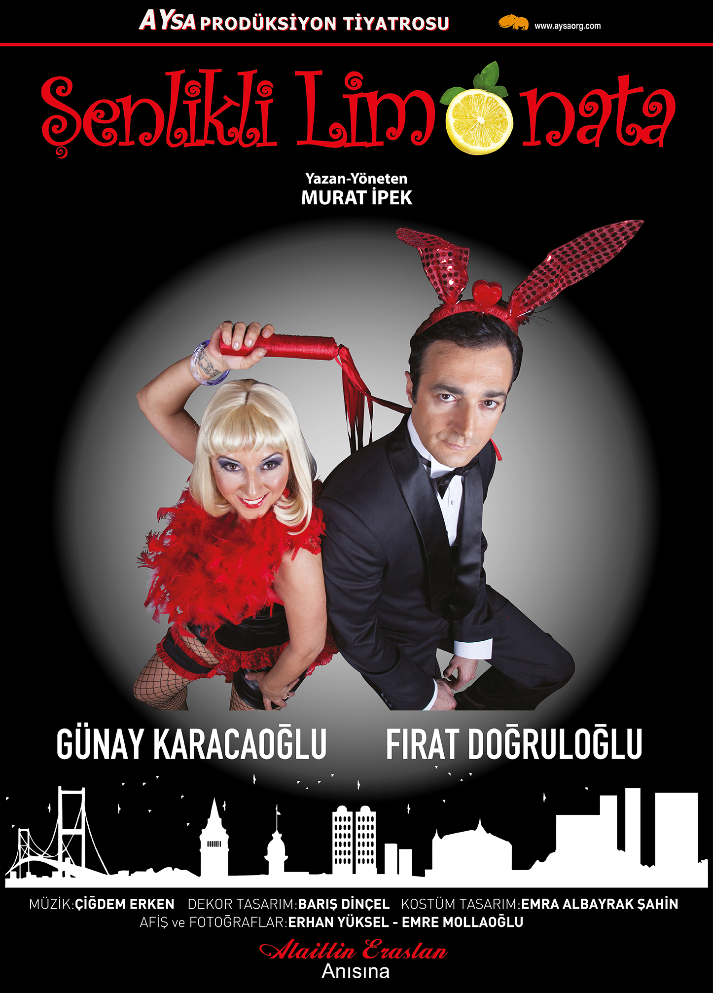 Günay Karacaoğlu ve Fırat Doğruloğlu’nun birlikte rol aldıkları kahkaha dolu yeni tiyatro oyunu “Şenlikli Limonata”; 12 Aralık 2013, Perşembe akşamı Trump Towers Tiyatro Salonu’nda perdelerini açmaya hazırlanıyor! Murat İpek’in yazıp yönettiği, AYSA Prodüksiyon Tiyatrosu’nun sahneye koyduğu “Şenlikli Limonata”; zenginin, fakirin, çirkinin, güzelin, bütün karşıtlıkların tek bir potada eridiği hayatlarımıza, iki insanın kara mizah ilişkisi üzerinden etkili bir ayna tutuyor.