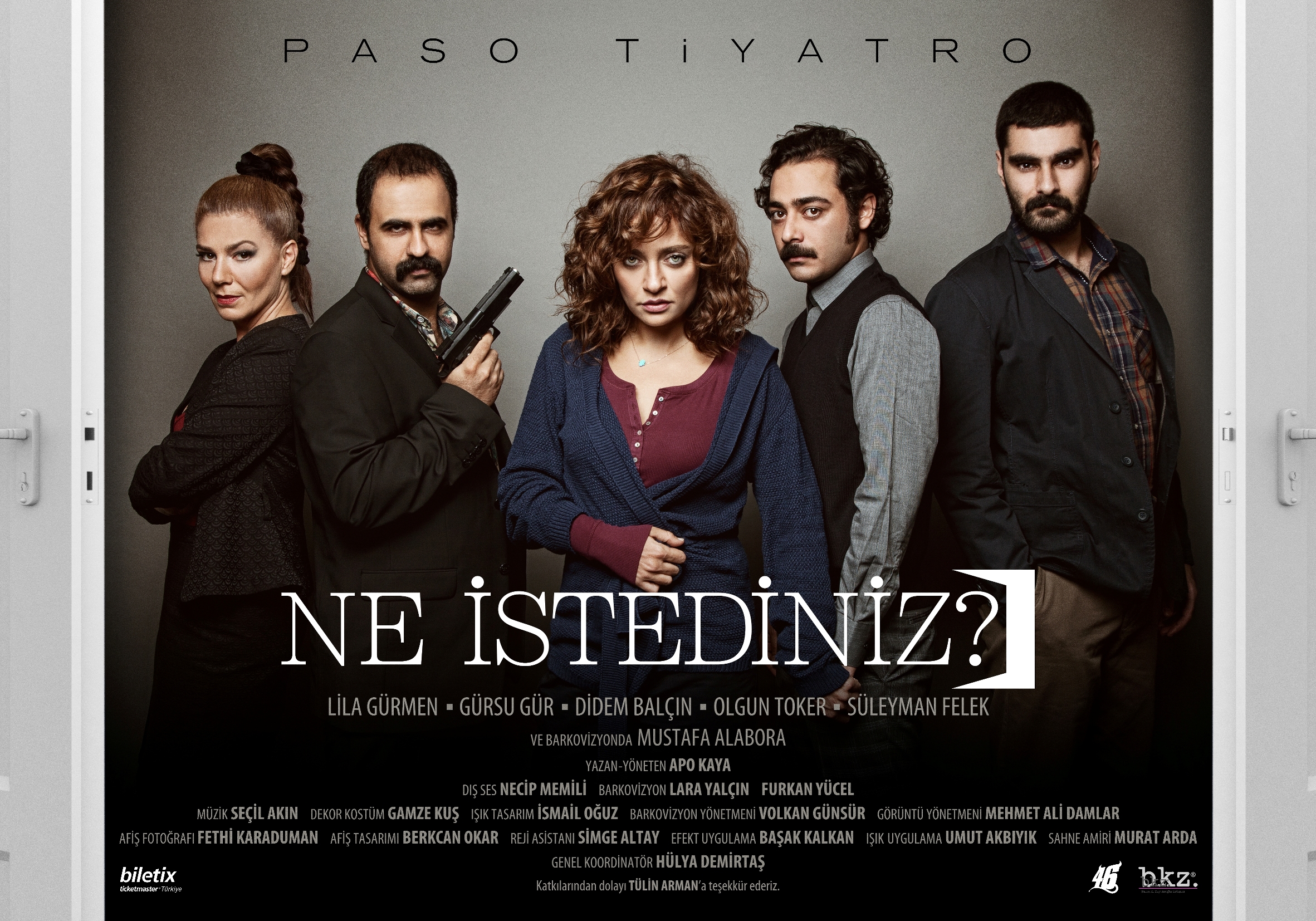 Afiş tasarımı Mehmet Turgut ve ekibi tarafından hazırlanan, müzikleri Seçil Akın imzası taşıyan Paso Tiyatro’nun yeni oyunu “Ne İstediniz?”e ait biletler Biletix’ten ve salonun gişesinden temin edilebilir.