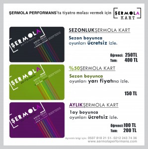 Şermola Performans’ta Ekim ayında ev sahibi Destar Tiyatro’nun geçen sezondan devam oyunları Gor ve Disko 5 No’lu oyunlarının yanı sıra birçok tiyatro ekibinin de oyunları sahne alacak. Ayrıca Şermola Kart sahibi olarak sezon boyunca Şermola’da sahnelenecek tüm oyunları daha avantajlı seyredebilirsiniz.