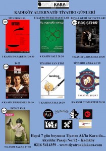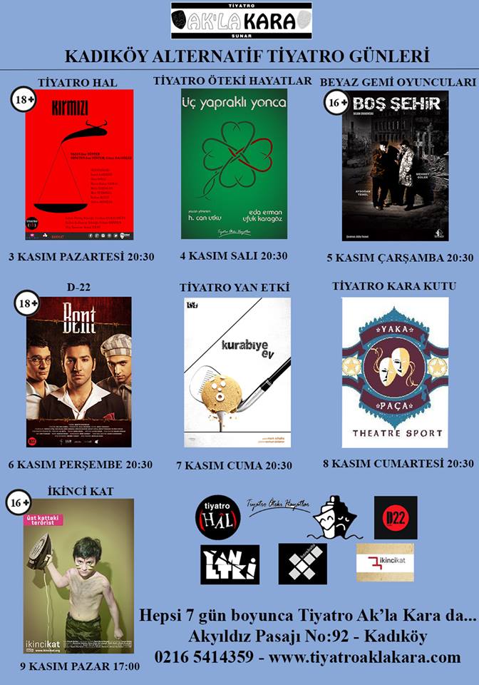 Tiyatro Ak’la Kara’nın Kasım ayındaki bir başka sürprizi ise Anadolu yakasında ilk defa düzenlenecek olan “Kadıköy Alternatif Tiyatro Günleri”