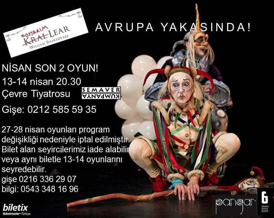 Altıdan Sonra Tiyatro&Pangar Ortak Yapımı “Soytarım Lear” Nisan 2015 Oyun Programı!