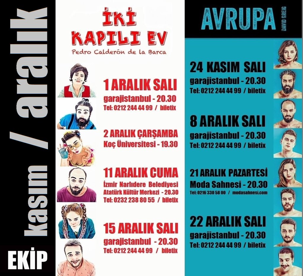 Nov 23Ekip Tiyatrosu İki Kapılı Ev ve Avrupa oyunlarını Aralık ayında Garajistanbul ve Moda Sahnesi’nde seyircisiyle buluşturmaya devam ediyor!